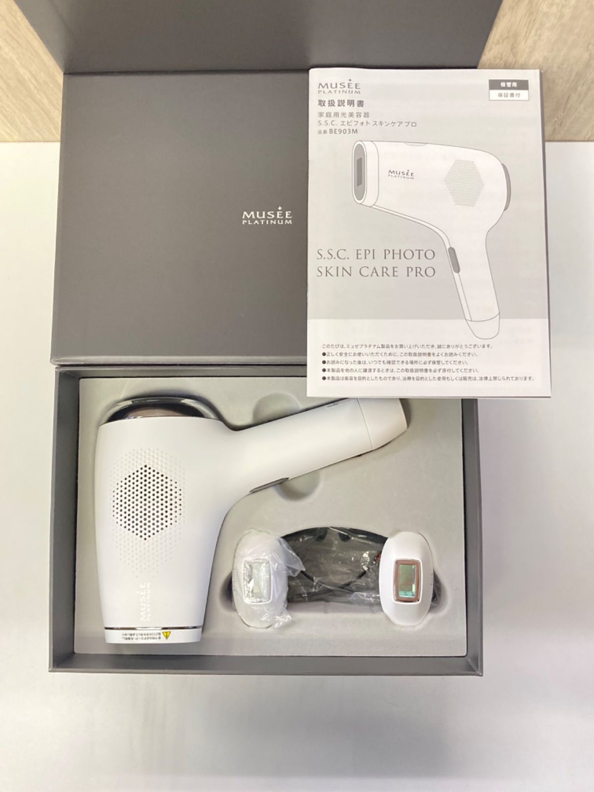 | 商品の特徴 | ミュゼプラチナム 脱毛器 美容機器 動画でカンタン♪光美容器の使い方。値下げしました!!!【新品未使用】ミュゼ 家庭用脱毛器。ミュゼ 家庭用脱毛器。ミュゼプラチナム MUSEE PLATINUM家庭用光美容器S.S.C エピフォト スキンケア プロ顔、身体、VIOまで全身のムダ毛にアプローチし、サロン品質のセルフケアを叶える光美容器。さらにフォトスキンケア機能付きで美顔器としても使え、キメの整った美肌へ導きます。●背中にも当てやすいL字型で快適にセルフケア●冷却機能で痛みを感じにくいセット内容・エピフォト スキンケア プロ(光美容器)※ 永久脱毛ではありません。Braun Series 3 ProSkin メンズシェーバー、シルバー。一時的な除毛減毛を目的としています。 使い方使用量目安週に1〜3回※中2⽇以上あけてください。① トリートメントする部位をシェービングします。② タッチパネルでモードを選択し、アタッチメントを装着します。・ムダ⽑ケア【Bodyモード】・顔のムダ⽑ケア【Faceモード】・フォトスキンケア【Photo Sモード】③ 専⽤ローション(別売)を塗布します。④ 専⽤ゴーグルを装着して、トリートメントする部位に出⼒レベル1からスキンテスト※を⾏います。※スキンテストの⽅法/スキンテストの注意事項は取扱説明書(P.16)を必ずご確認ください。⑤ 出⼒レベルを設定します。⑥ 照射ボタンを押し、照射します。※詳しいご使⽤⽅法は必ず取扱説明書をご確認ください。4年ほど前にミュゼで購入した家庭用脱毛器です。脱毛器以外にもスキンケアの美容器としての機能がついています。数回使用しましたがほとんど使用していません。動作確認済みです。コードに繋げて照射するもので充電式ではありません。タッチパネルで操作するタイプで冷やし機能もあるので痛みが苦手な人は比較的安心感あると思います。最後の写真の上の数字が0になると使用できないみたいです。写真は動作確認を行った時の数字です。部品全て揃っています。箱や説明書も全てあります。定価72,600円。値下げしました!!!【新品未使用】ミュゼ 家庭用脱毛器。ReFa EPI W リファ エピ ダブル定価88,000円。新品。。ケノン 脱毛器 7.2ver. ゴールド。ケノン Ver7.2 プレミアムカートリッジ 眉毛器具付き 脱毛器 残98.8%。新品未開封 CLEAR MAX 脱毛器 ブラック ホームクリアマックス。ケノン脱毛器 ver8.5。Ulike IPL脱毛器 本体と付属品 億子。光美容器 デリケートゾーン可 フェイス可 パナソニック。Braun Series 9 Sport+ シェーバー。ブラウンシルクエキスパートPro5 PL5137。新品未開封 JOVS DORA 1.1 ジョブス ドラ 脱毛機 美容機器。Panasonic 脱毛器 ES-EY4A-W。美品 ケノン フラッシュ式脱毛器 ver.8.7。ブラウン シリーズ9Pro+ 9516s-V。【美品】ブラウンシリーズ9/電気シェーバー/Type5791/4枚刃 (Z2)。ケノン KE-NON シャンパンゴールド 8.6J スーパープレミアム2。【LE-9】パナソニックラムダッシュパームインLITE ES-P330U。ke-non ケノン 脱毛器 NIPL-2080 エムテック バージョン8.6J。美品 ver.8.6 ケノン 脱毛器 マットブラック 美顔器 ケノン❷。ステラボーテ 脱毛器 SB-IFD01-WH。Panasonic メンズシェーバー ES-LT5A。KE-NON 脱毛器 パールホワイト | ||